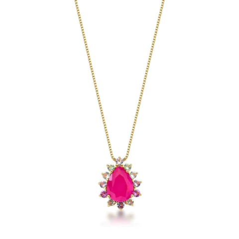 Romântico e moderno! O Colar Cinthia com pedra fusion rosa e banho a ouro traz um charme único para o seu visual.