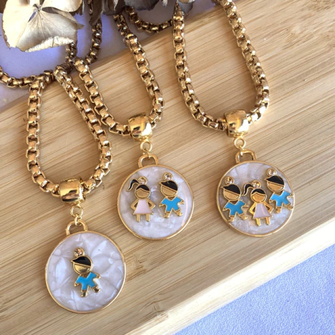 Colar em semi jóia com (2 filhos). Escolha o 1º e 2º filho ou filha na ordem em que deve ser personalizado o seu colar.