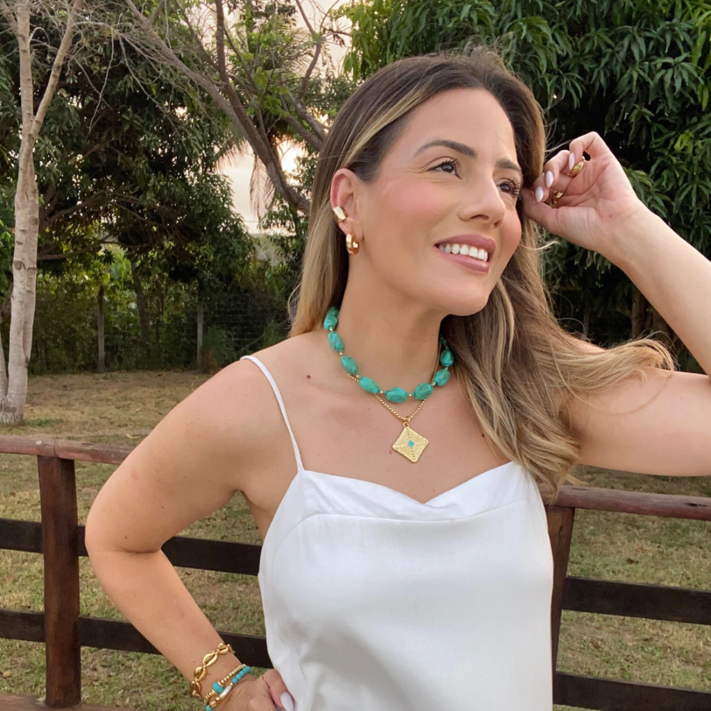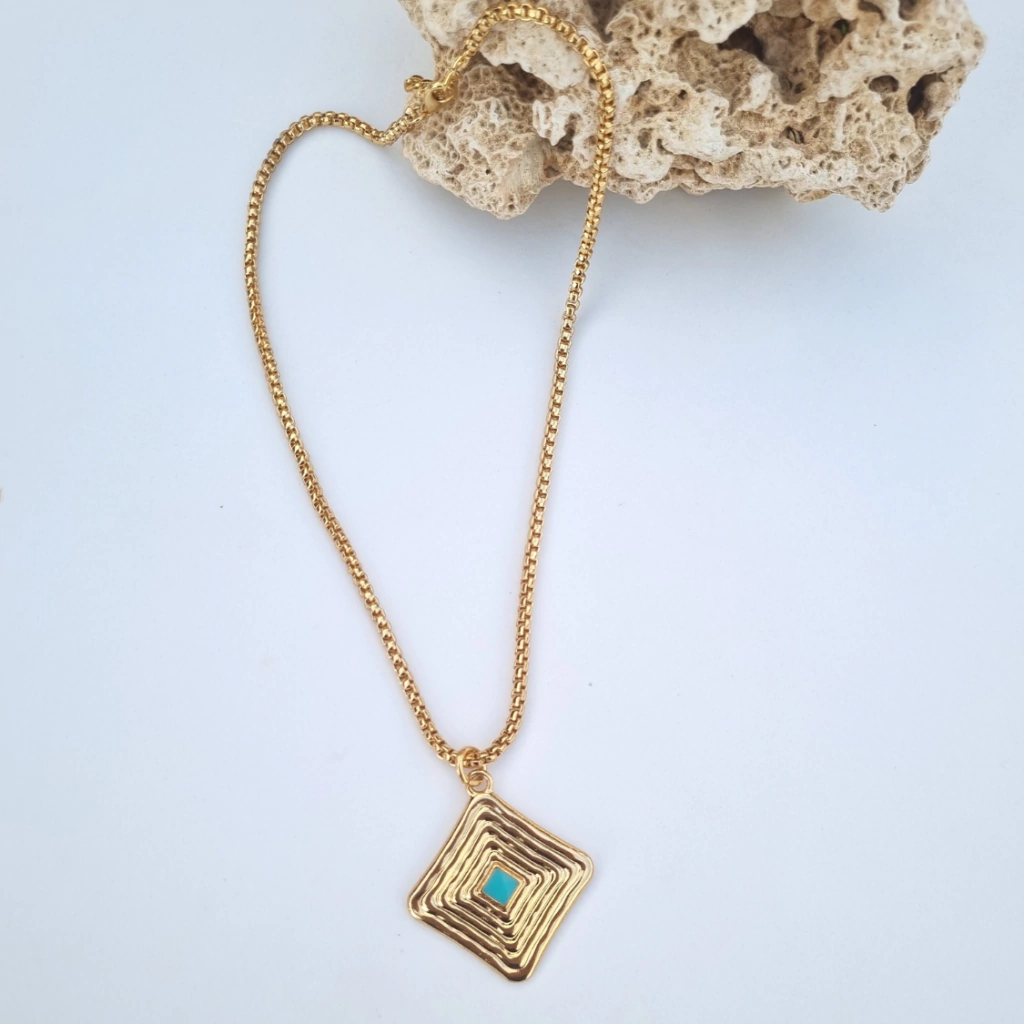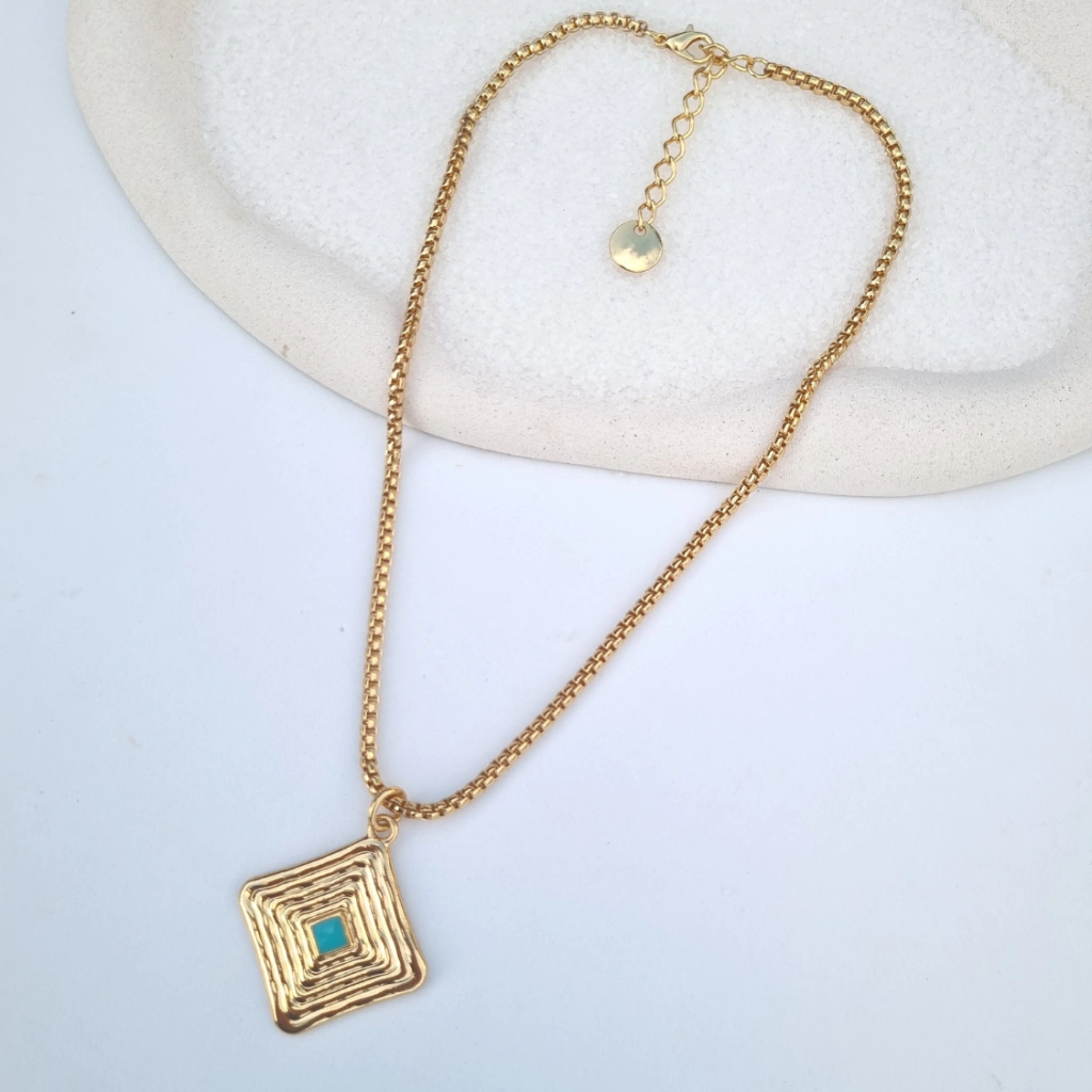 O pingente em formato geométrico com detalhe em esmaltação turquesa, é ideal para usar sozinho ou em composições com outros colares, criando um efeito moderno e estiloso, para os looks de verão.