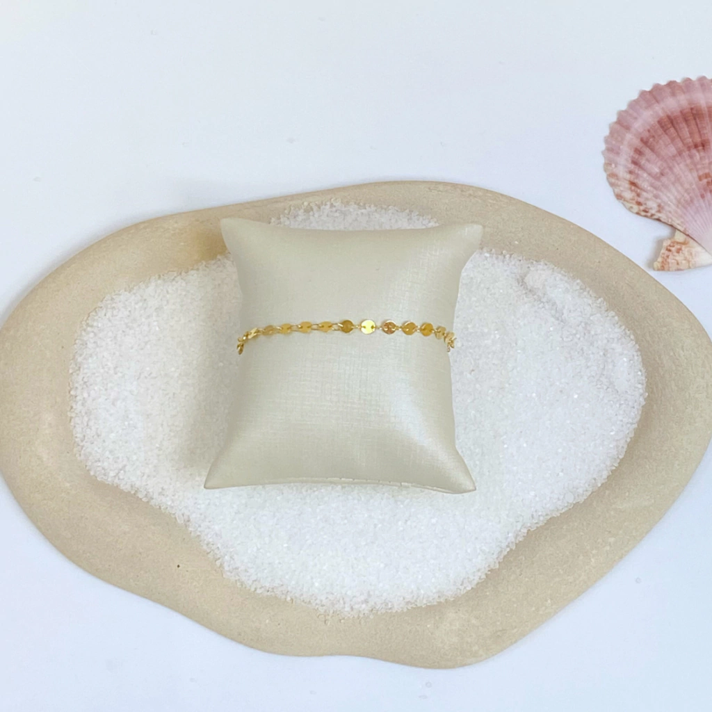 Uma Pulseira versátil e delicada com medalhinhas banhadas a ouro 18k. Seu design minimalista traz um toque sofisticado e atual, perfeita para usar sozinha ou fazer mix com outras pulseiras. Versátil, pode ser usada tanto em looks casuais quanto em produções sofisticadas, destacando a beleza natural de quem o usa.