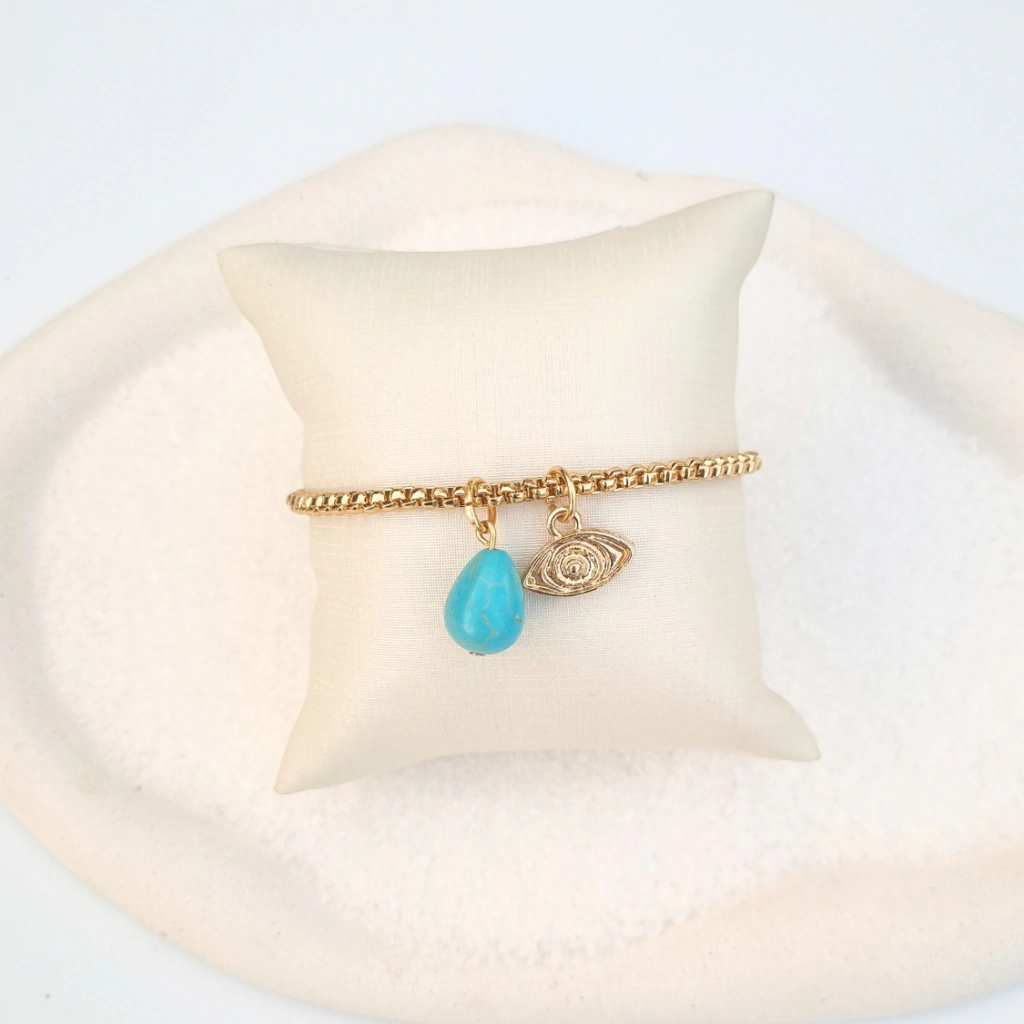 Os pingentes de olho grego e pedre turquesa, é ideal para usar sozinha ou em composições com outras pulseiras, criando um efeito moderno e estiloso, para os looks de verão.